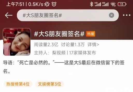 再来看大S朋友圈的个性签名,她的签名则是“死亡是必然的”。