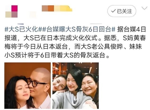 台媒爆料称,大S离世第二天就已经在日本火化了,对此,引发了网友的质疑。